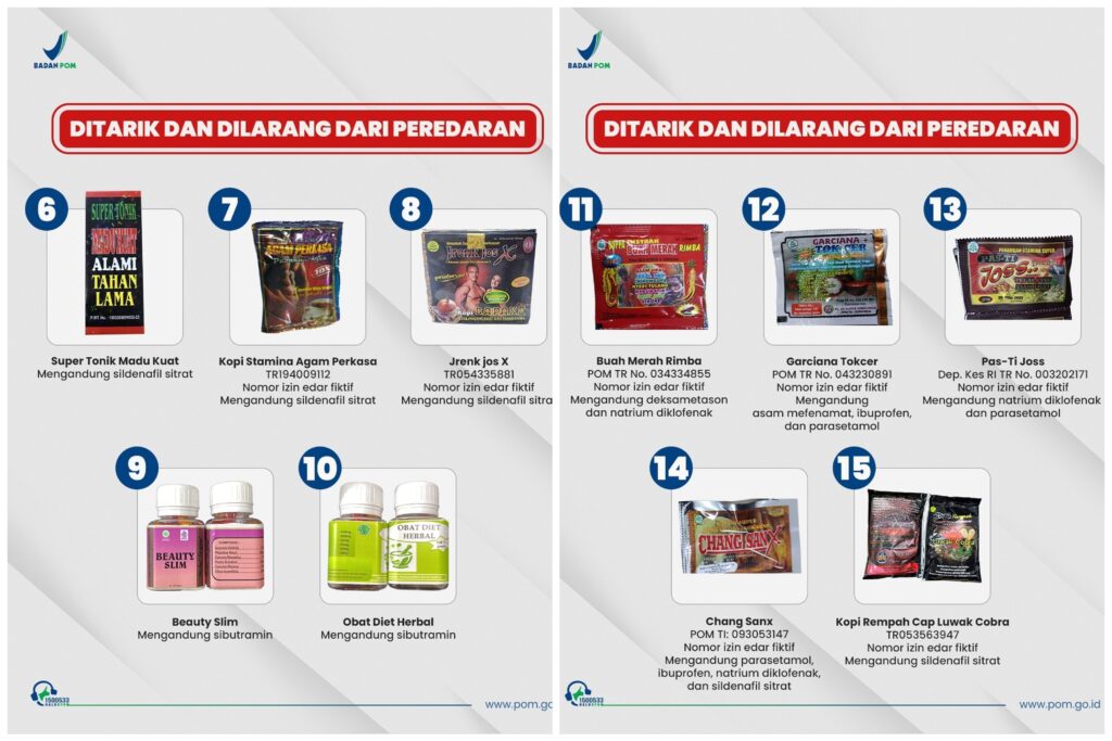 Setidaknya ada 15 produk yang diungkap BPOM, di mana pengungkapan ini merupakan hasil pengawasan intensif BPOM melalui kegiatan sampling dan pengujian selama September 2025, pada 1.639 sampel produk obat bahan alami, obat kuasi, dan suplemen kesehatan.