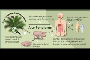 “Penularannya lewat kelelawar. Biasanya kelelawar menggigit buah, lalu buah itu dimakan tanpa dicuci atau dimasak, di situ virus bisa menular,” katanya.